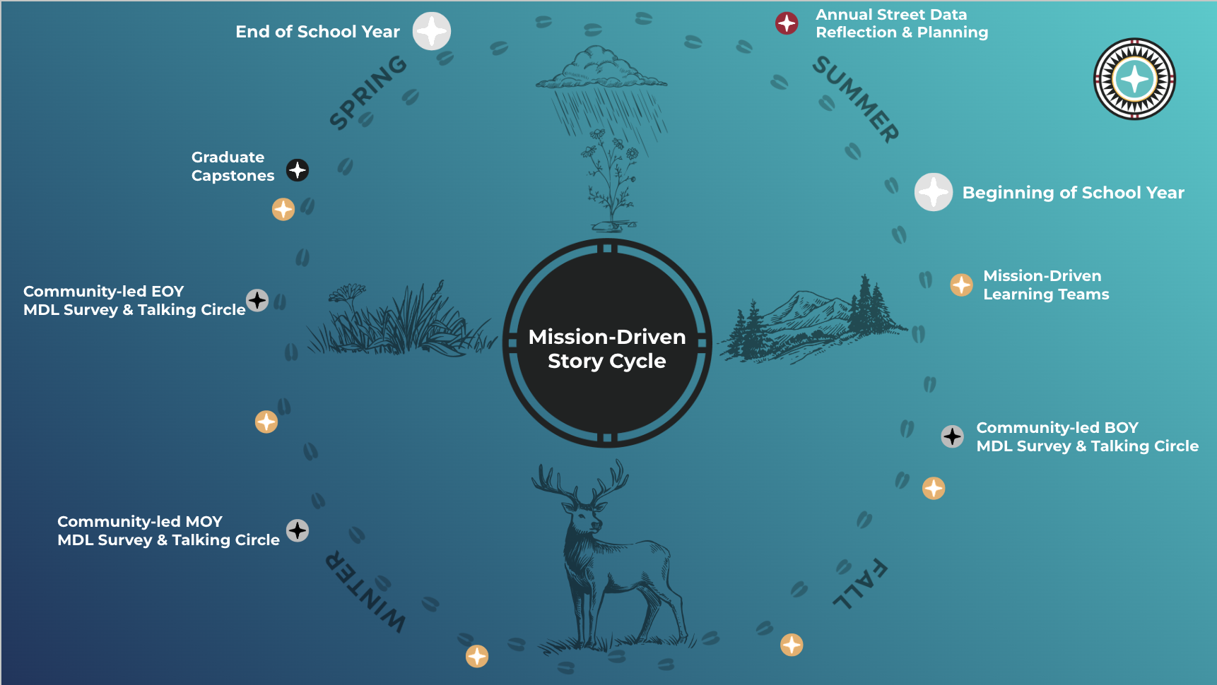 NISN believes that communities know best how to determine the goals for their children and how to critique existing systems for greater alignment to their desired results. The Mission-Driven Story Cycle (MDSC) is a community-led improvement process that helps schools translate their mission into meaningful learning experiences and outcomes for students through an annual framework that prioritizes student voice, teacher agency, and community-led design via graduate profiles and capstones, collection and analysis of street data, and ongoing iteration. This continuum facilitates the alignment of teaching, learning, and professional development to the school’s Indigenous education mission supported by and documented within the MDSC Annual Report. Through MDSC, schools work with NISN to build systems that connect: